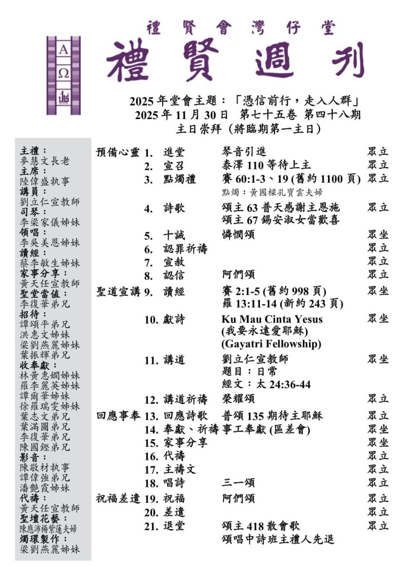 明日是將臨期第一主日。普世教會將聖誕節前的四個主日定為將臨期。遠古時候人們盼待救主臨到世界,今天我們亦要預備主將來再臨。屆時祂抹去人的眼淚,實現永久的公義和平。我們早上11:00見。