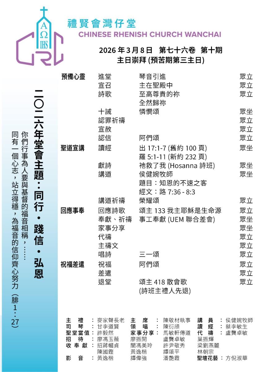 下雨天時,請把已用雨傘留在教會入口的傘架上,或用自備膠袋套好後才帶進堂內。切勿讓雨傘水滴濕地板,免引致意外。謝謝各位。(「管制即棄塑膠」法例現已生效,教會不再提供即棄雨傘套。)