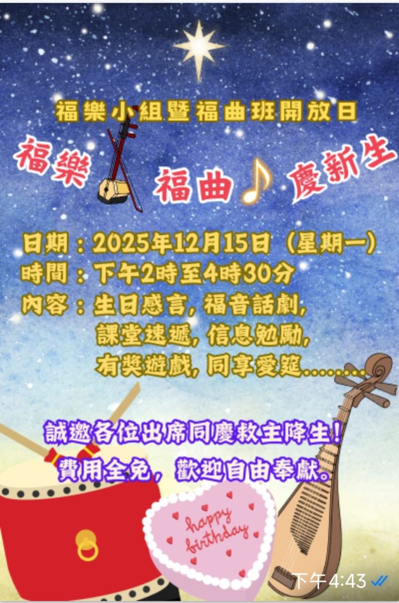 聖誕聯歡15/12(一)下午2:00-4:30舉行,報名:潘艷霞姊妹,14/12止。