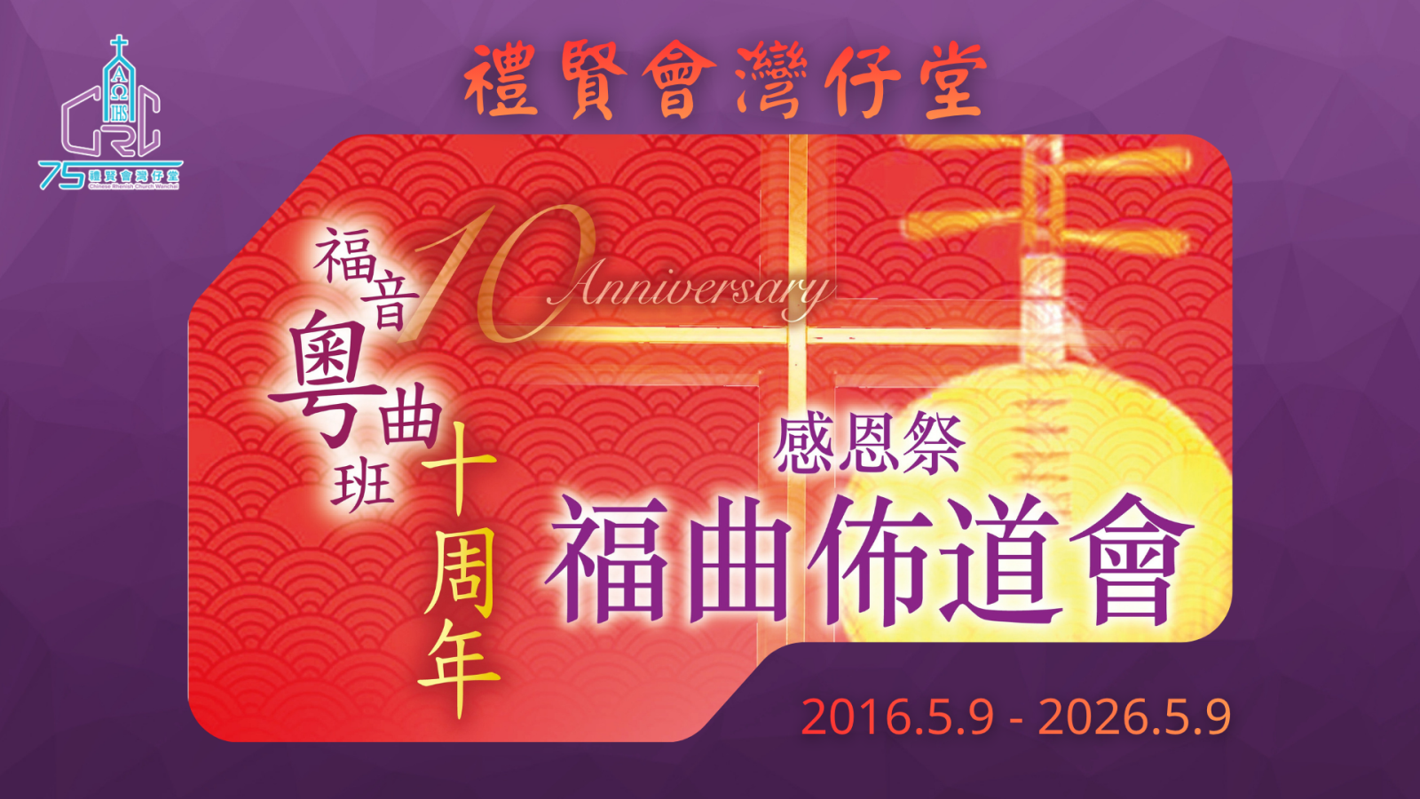 「福音粵曲班十週年感恩祭」福曲佈道會於9/5(六)下午3:00-4:30在聖堂 舉行,中樂獻奏,同唱福音粵曲,黃天任宣教師分享信息。請代禱並廣邀親友。現招募招待及陪談員,當日下午2時到場預備;報名:請於26/4前 聯絡黃宣教師或潘艷霞姊妹。